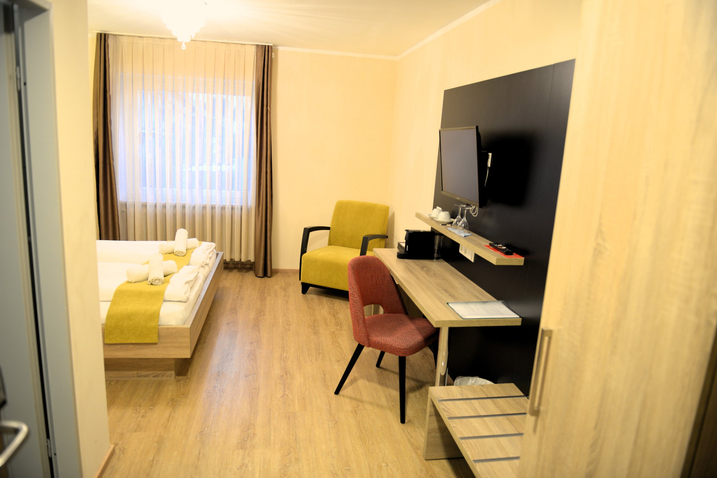Unsere gemütlichen Doppelzimmer haben mindestens 22m², ein Bett mit 180x200 Größe und verfügen über WC, Dusche, Föhn, Schreibtisch mit Sessel, Telefon, WLAN, HD-TV, Tresor, Kleiderschrank und Kofferablage.